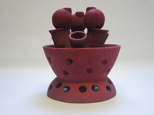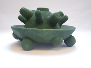 Mijn vormentaal is gebaseerd op intuïtieve tekeningen. De abstracte vloeiende lijn uit de tekeningen is door middel van boetseren en via een mal overgebracht in het materiaal klei. Met zilverzand en fel gekleurde pigmenten, meegenomen na een studiereis naar India, probeer ik de diversiteit binnen een groepskader weer te geven. De gepigmenteerde vormen lijken te komen uit de intuïtieve, associatieve onderwaterwereld.